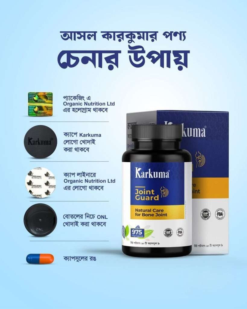 Karkuma Joint Guard is a functional food product, specially formulated to natural care for bone joint. Its basic raw materials are United State Department of Agriculture (USDA) Organic certified and collected from the different authentic sources in the world.